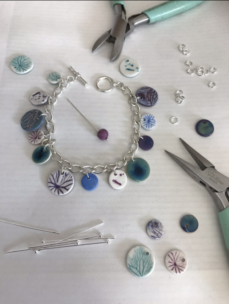 My jewellery is inspired by taking elements from my larger pieces of work to create wearable pieces. Some of my collections have gold, platinum or copper detailing which when fired to a low temperature permanently fixes the metal to the porcelain piece and adds a delicate sparkle to the item being worn”.