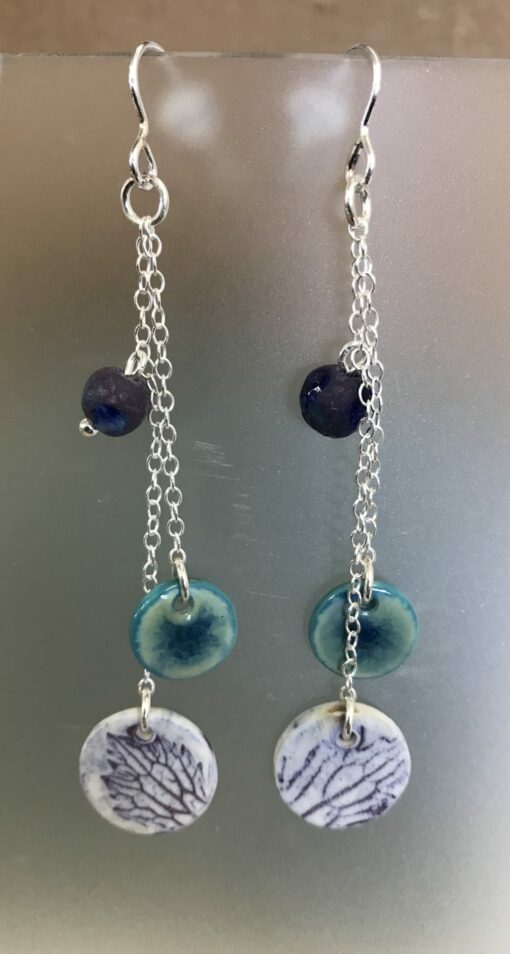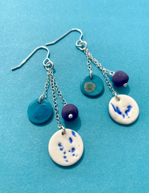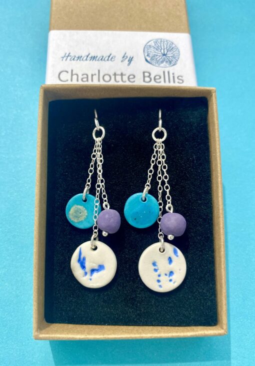 Charm earrings are decorated with glaze and leaf print discs with handmade beads on delicate sterling silver chain with silver ear hooks and backings. Available in two different lengths, 5cm or 6.5cm