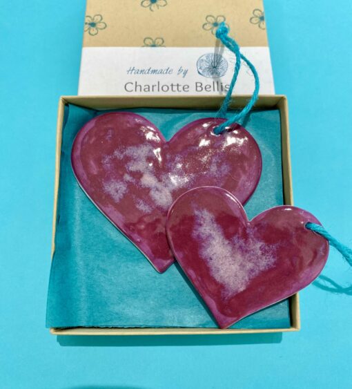 Two handmade porcelain heart decorations with a violet glaze. Both decorations come in a hand decorated natural box.