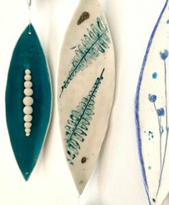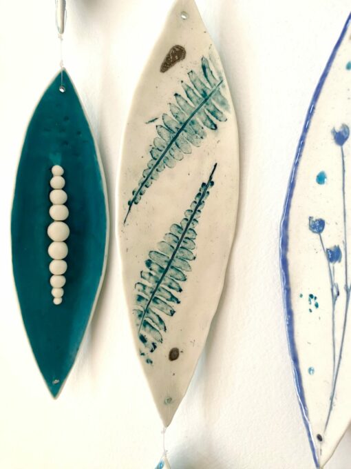 A stunning wall hanging made out of porcelain pieces decorated with various flower pressings and textures inspired by nature and organic forms. Each piece is handcrafted into a range of shapes, bisque fired, hand painted with glazes before being re-fired in the kiln. Each piece is then suspended onto a piece of driftwood.