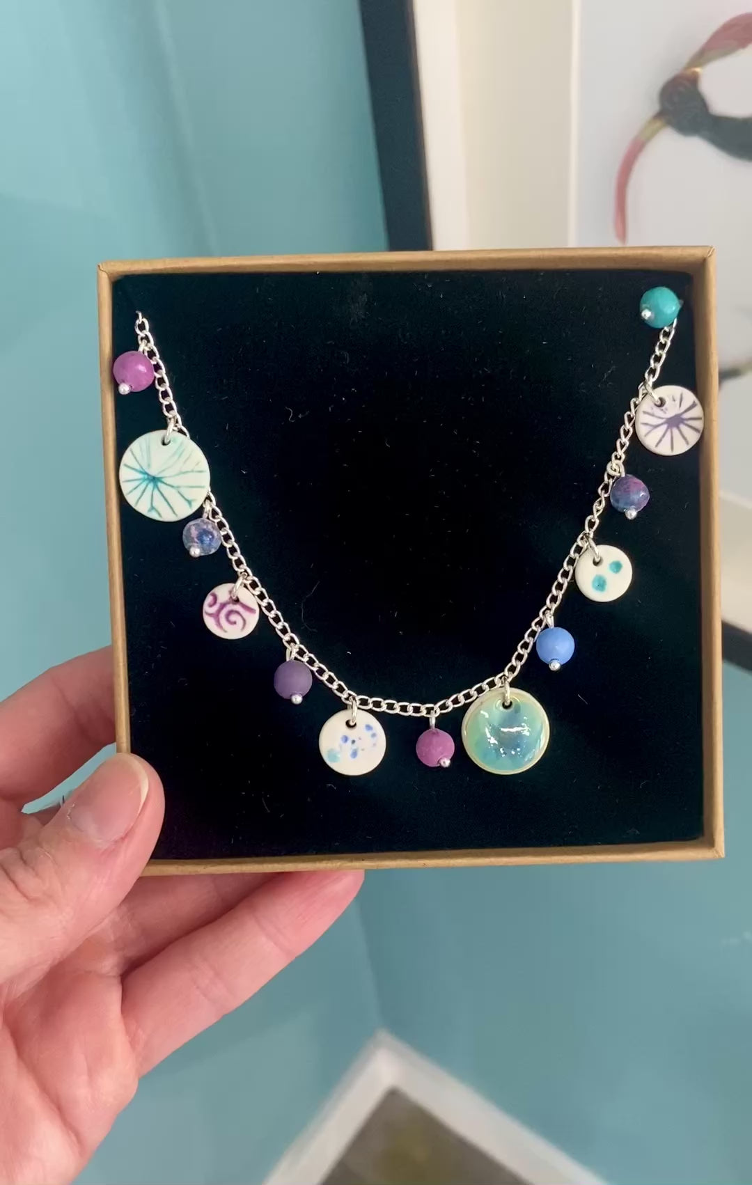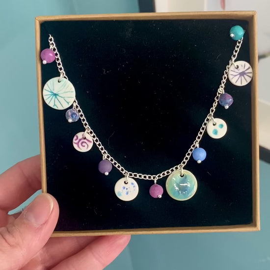 Adorned with handmade beads and beautiful discs decorated with various textures, glazes and delicate pressings taken from leaves. Features a lobster clasp and extendible solid silver chain with adjustable length 16inch - 18inch.