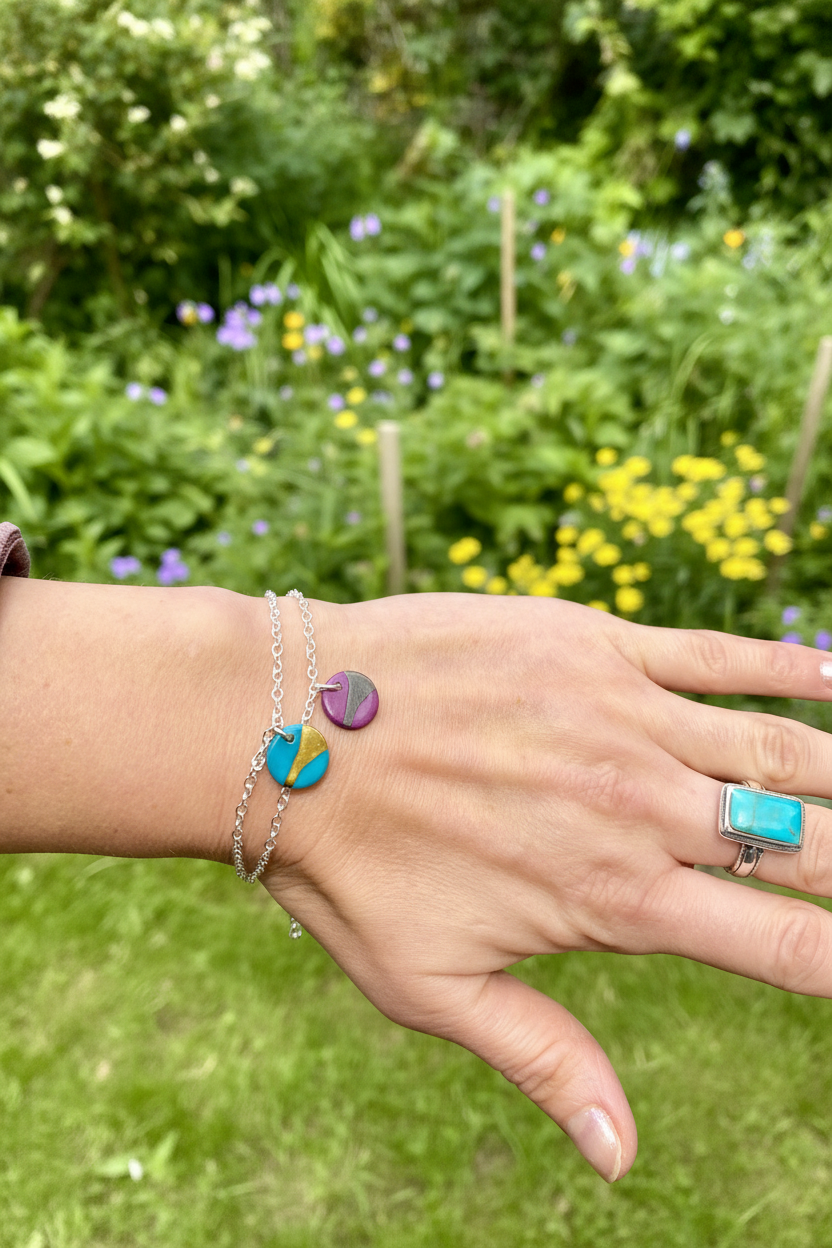A colourful disc bracelet with 24ct gold lustre on a solid silver chain and clasp.