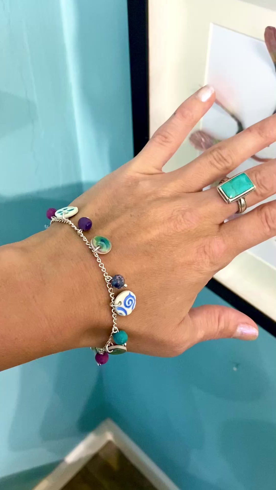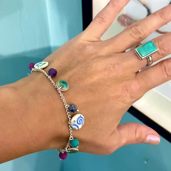 A delicate bracelet with handmade beads and beautiful discs decorated with various glazes, textures and delicate pressings taken from leaves. Each disc is handmade and decorated on both sides.