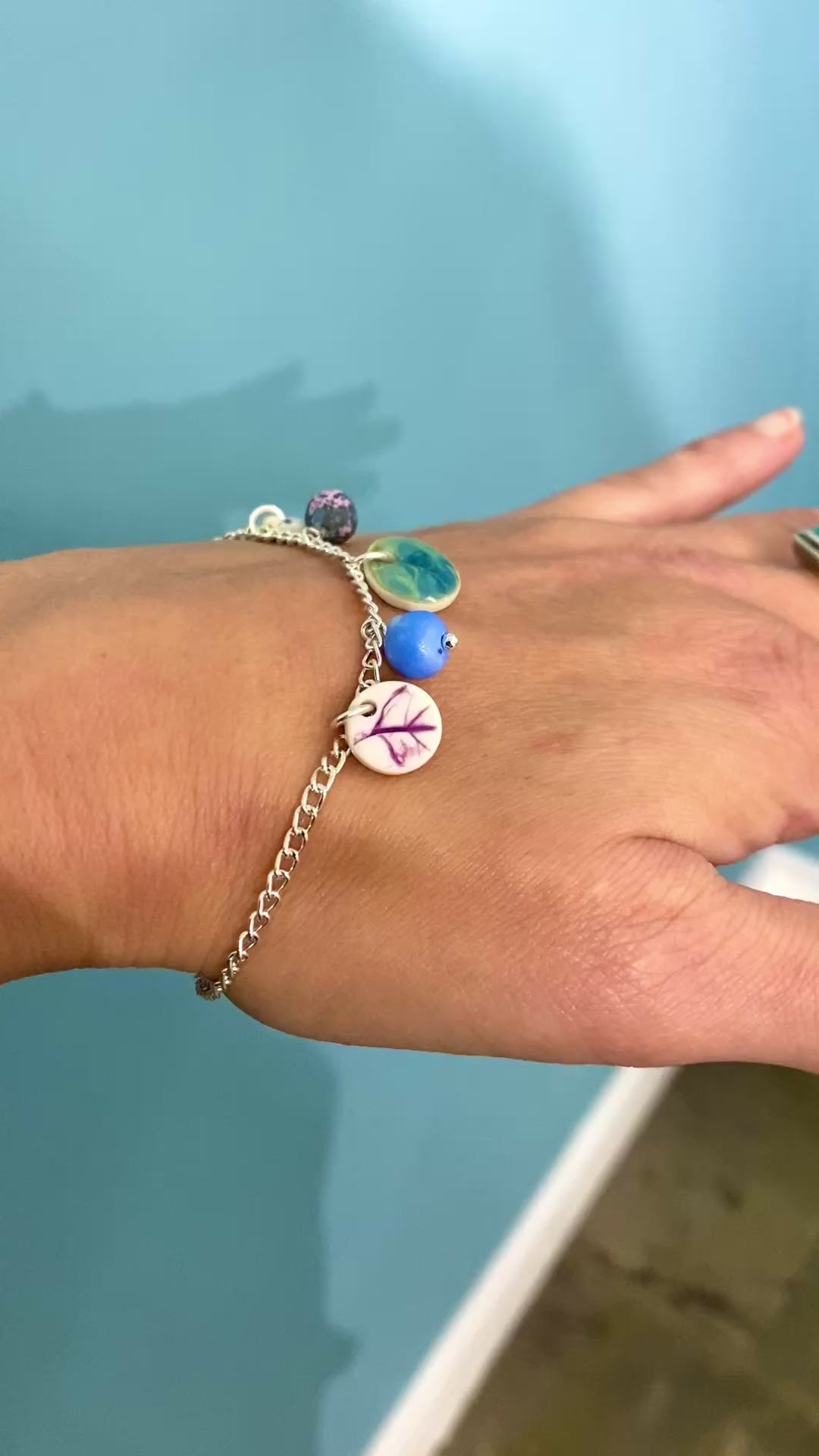 A delicate bracelet with handmade beads and beautiful discs decorated with various glazes, textures and delicate pressings taken from leaves. Each disc is handmade and decorated on both sides.