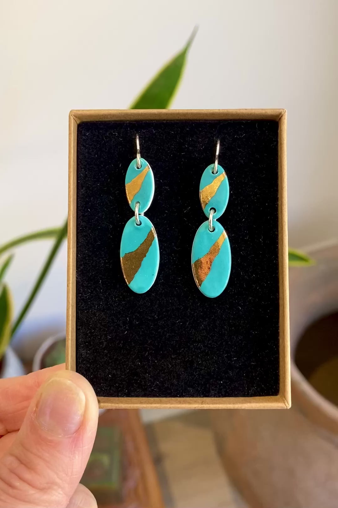 A colourful oval earring with 24ct gold lustre. Connected together with a silver ring for movement. All earrings come on a silver hook with rubber backings.