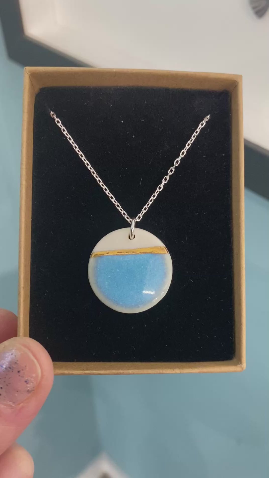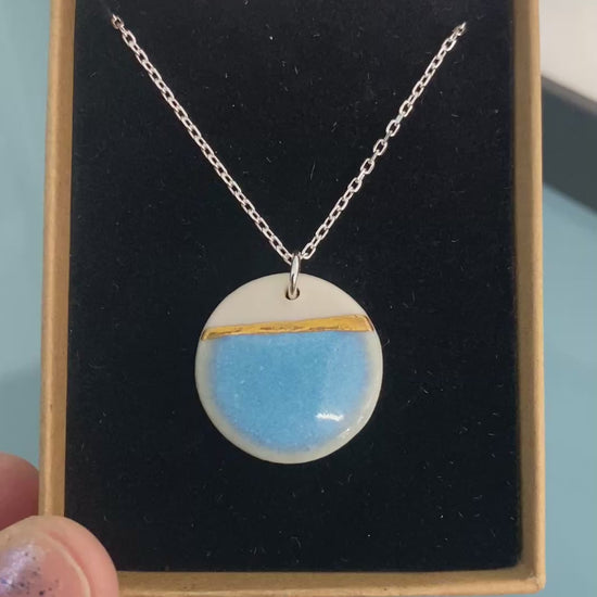 Sea Breeze disc necklace with 24ct gold lustre on a silver chain that compliments the disc.