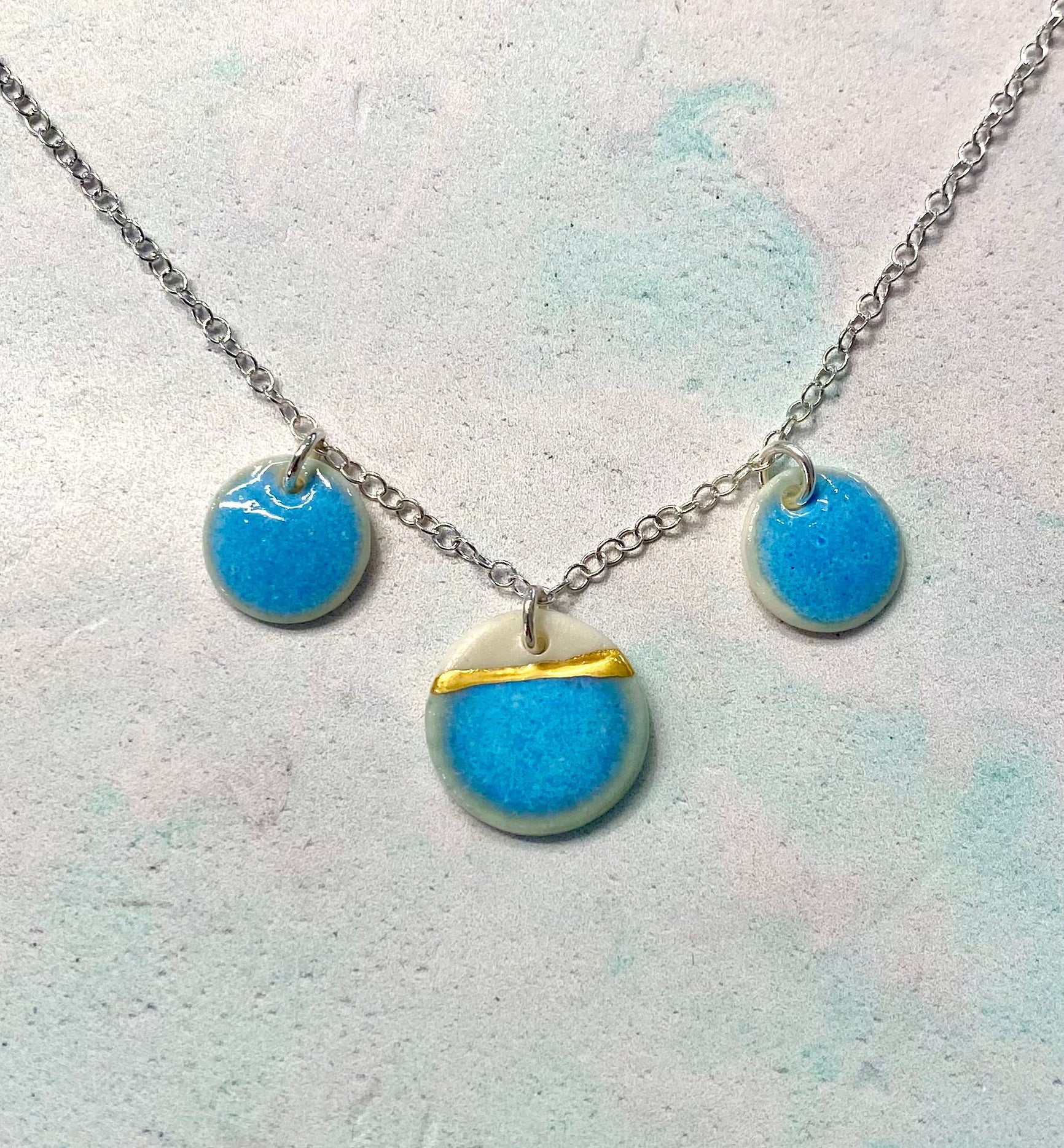 Sea Breeze necklace with 24ct gold lustre with two smaller glazed discs ether side on a silver trace chain.