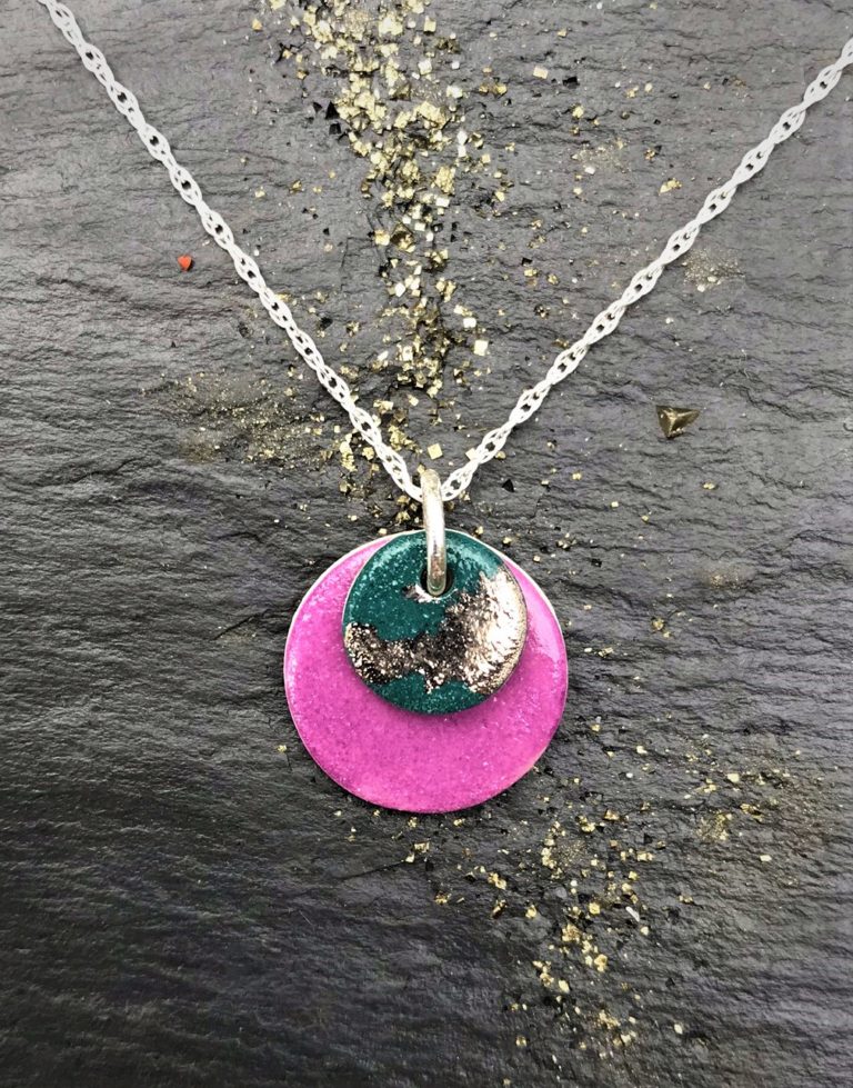 A coloured larger disc with a smaller disc on top with platinum detailing. Comes on a delicate silver rope chain which compliments the size of the discs.